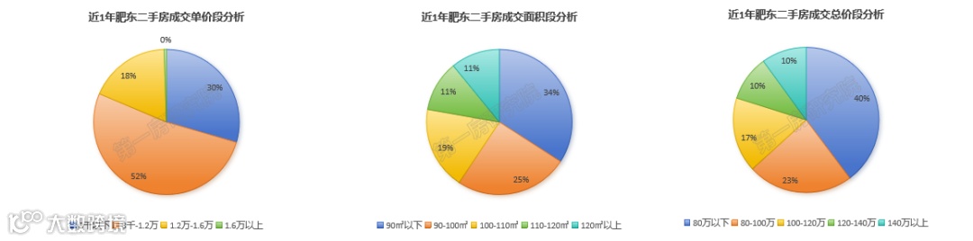 从近1年肥东新房结构性成交来看,单价在1.2-1.4万和单价在1.4-1.6万的房源成交占比最多,占比都在42%,说明这部分房源决定了肥东整体市场均价,也是肥东市场主力;面积方面,100-120㎡和100㎡以下的房源为市场成交主力军,成交占比均为40%;总价段方面,130-160万总价的房源成交占比最大,占比约40%,其次是100-130万,占比约28%。整体来看,近1年肥东的新房成交以刚性需求极强的客户为主、其次是少量刚改。