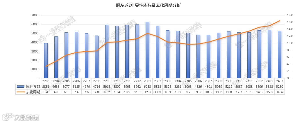 显性存量方面,近2年肥东显性存量在5232套,平均去化周期10.4个月,月度去化周期呈上升趋势,但整体存量及去化周期相对可控。