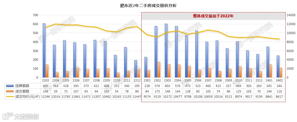 根据第一房研究院AI楼市指数系统统计数据显示,肥东近2年二手房月均新增挂牌量394套,月均成交量104套,成交均价为10173元/㎡,低于新房整体成交均价接近3800元/㎡。分月度看,2023年整体成交量高于2022年,2023年月均比2022年高20套左右。成交均价近1年下滑接近1800元/㎡,市场出现明显的以价换量情况。