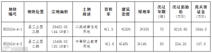 备注:体规划指标按怀宁经开区管委会出具的JGT2024005、JGT2024008规划条件执行;地块起始价不含契税、印花税;地块准确面积以测绘部门提供的宗地图为准;地块其他出让信息以出让文件为准。