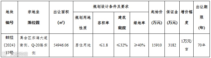 蚌埠暂定5月22日拍卖1宗涉宅用地,面积82亩
