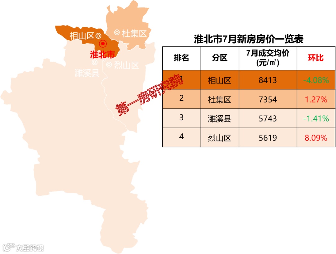 其中,烈山区价格涨幅最大,为8.09%。相山区价格最高,为8413元/㎡,其次是杜集区,均价为7354元/㎡。