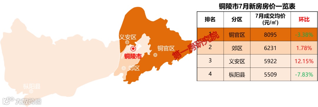 铜陵三区一县中,房价环比上涨的区域为郊区和义安区,铜官区和枞阳县房价环比下跌。