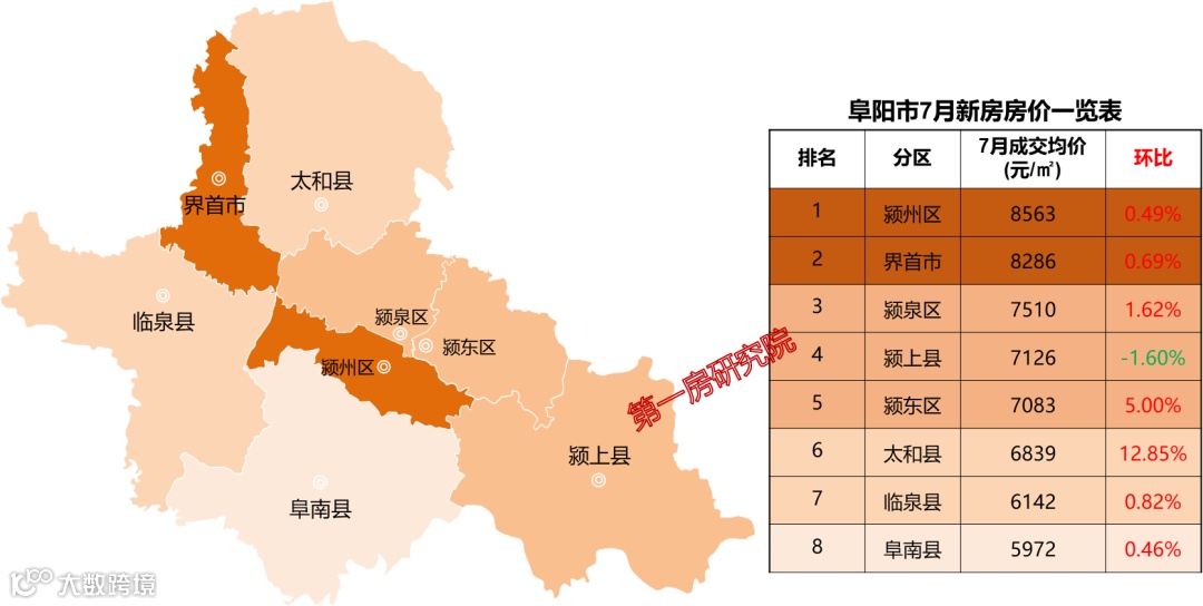 其中,价格涨幅最大的为太和县,涨幅为12.85%,而颍上县跌幅为1.6%。颍州区、界首市的价格均超过八千,而颍泉区、颍上县和颍东区价格超过七千。