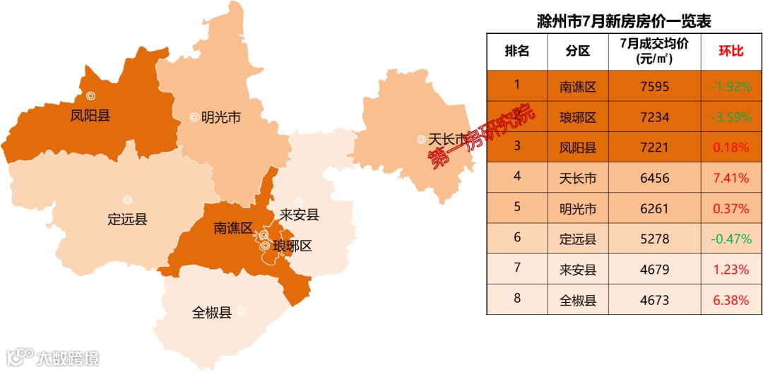 滁州两区六县中,5区县价格环比上涨,3个区县价格环比下跌。