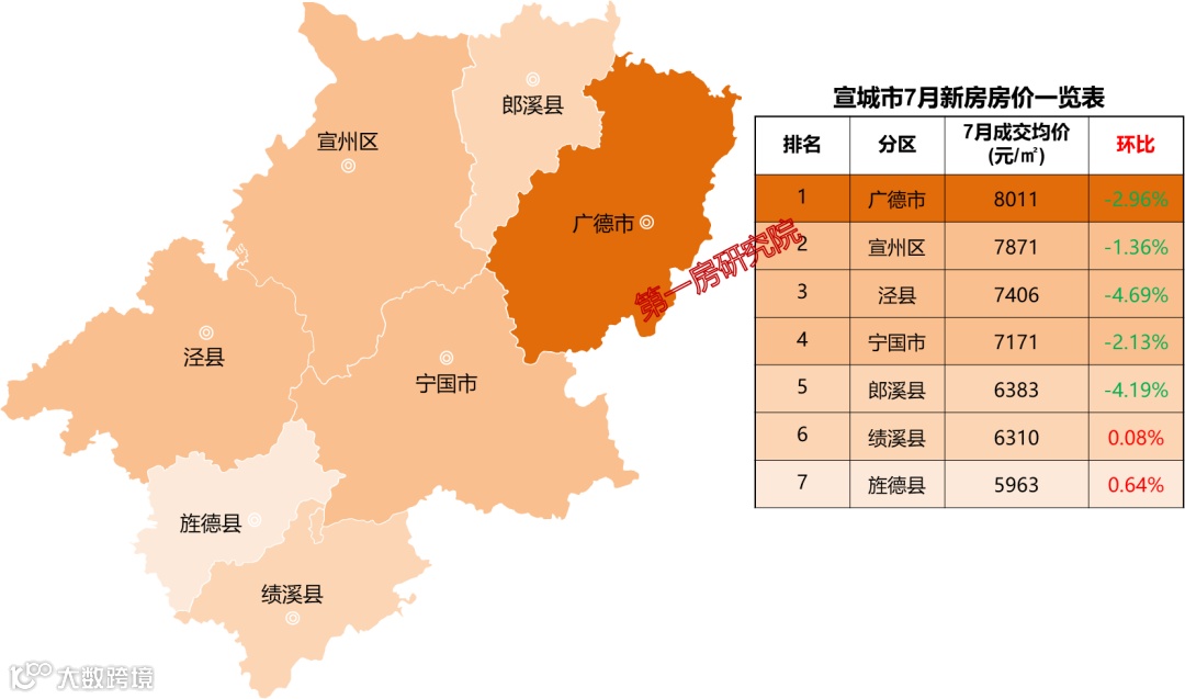 其中,泾县价格环比跌幅最大,为4.69%,广德市价格最高,均价超过8千。