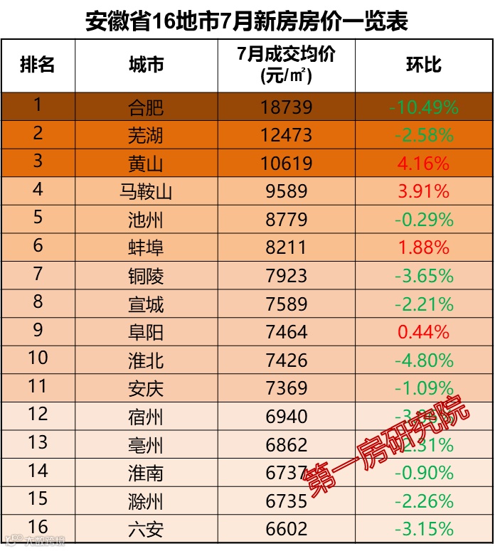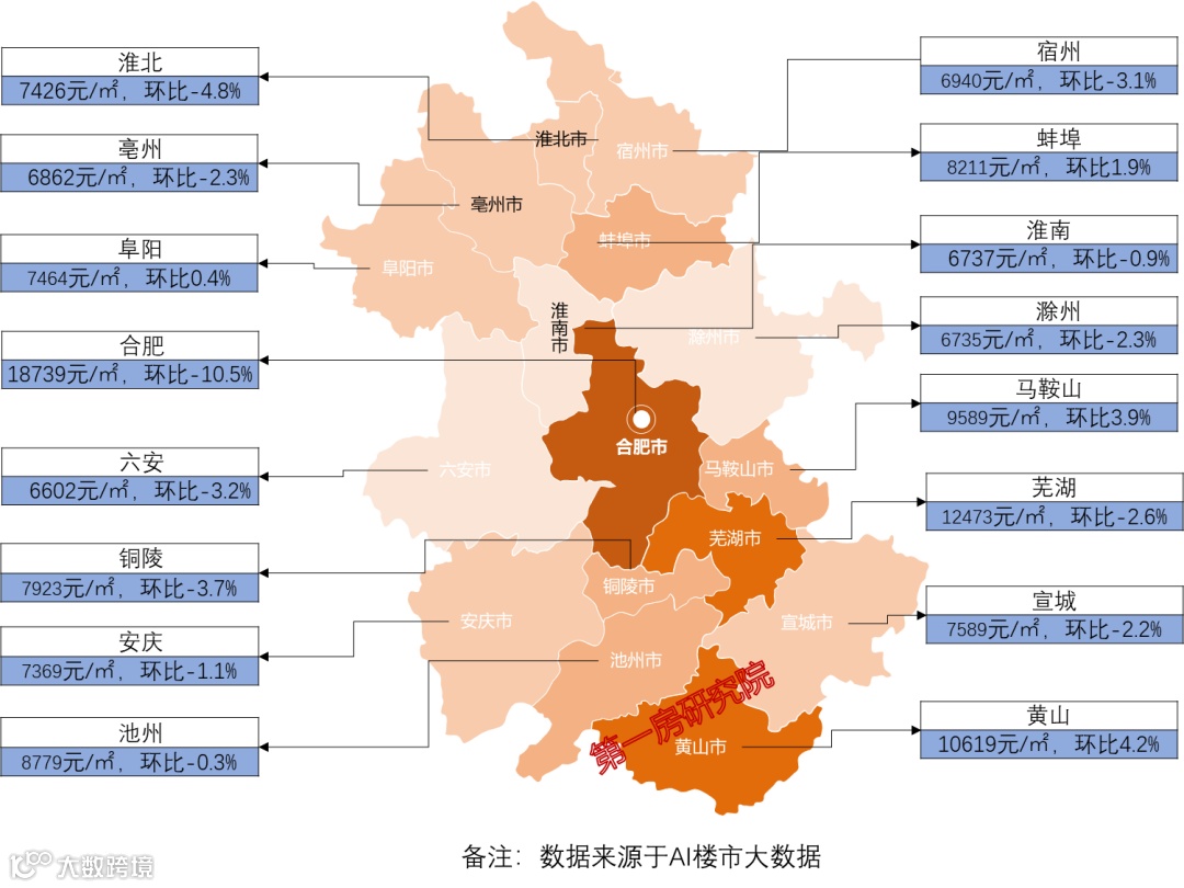 从整体来看的话,安徽16城市仅4城房价环比上涨,其余12城房价不同程度下跌。