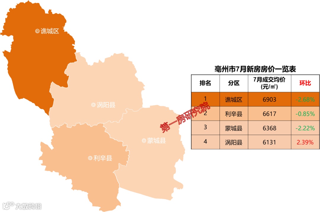 其中,价格跌幅最大的为谯城区,幅度为2.68%,价格最高也是谯城区,价格为6903元/㎡。