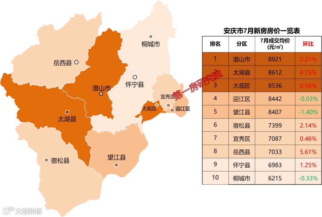 安庆三区七县市中,7个区县房价环比上涨,3个区县价格环比下跌。