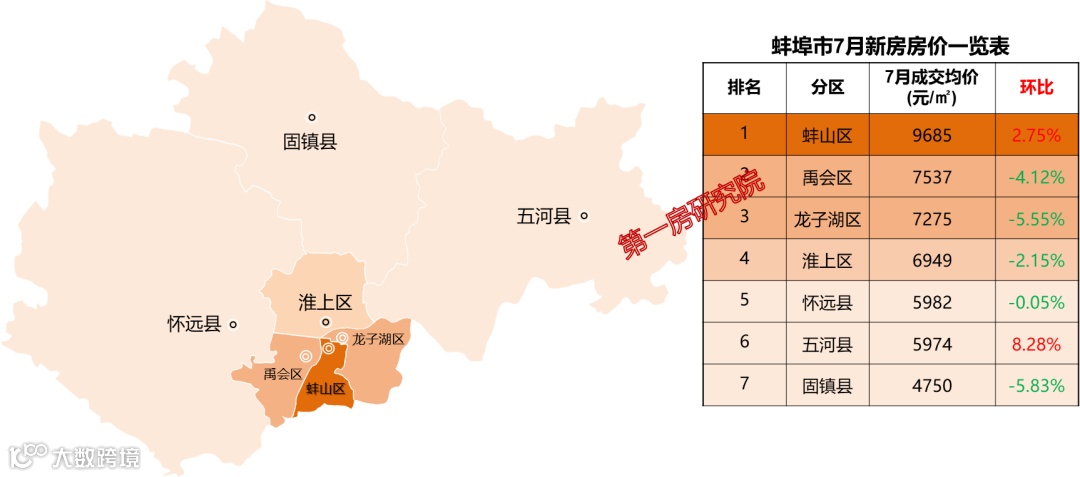 蚌埠四区三县房价中各有一区和一县环比上涨。