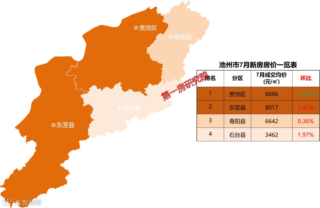 池州一区三县中,价格环比上涨有三个区县,价格环比下跌仅一个区。
