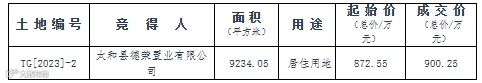 经太和县人民政府批准,太和县自然资源和规划局于2023年6月13日以拍卖转挂牌方式出让TG[2023]-2号宗地国有建设用地使用权。现将成交结果公示如下: