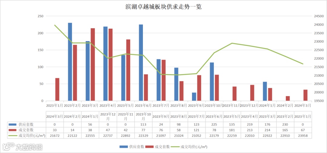 再从市场供求来看,卓越城板块受市场整体大环境下行的影响,以价换量情况相对凸显。自去年6月份开始,成交量长时期处于筑底横盘期,成交均价则从去年1月份的23958元/㎡下滑到今年3月份的21672元/㎡,降了2286元/㎡。