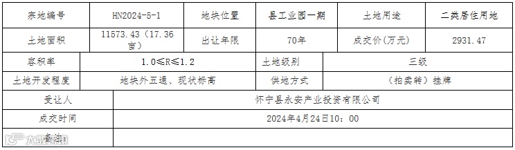 怀宁县永安产业投资竞得1宗涉宅用地,成交价2931.47万元