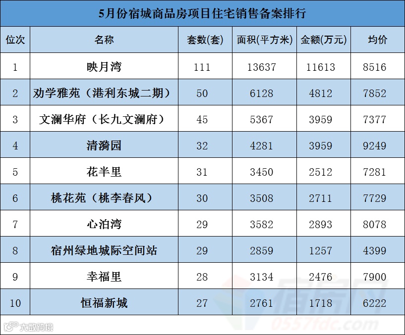 5月份,映月湾项目摘得宿城商品房项目住宅类销售冠军,单月备案111套,住宅均价8516元/平方米,这也是该项目自3月份开始连续第三个月摘得销冠。劝学雅苑项目位居榜单第二位,单月备案50套,住宅均价7852元/平方米。文澜华府项目位次与上月持平,位居榜单第三位,备案45套,住宅均价7377元/平方米。