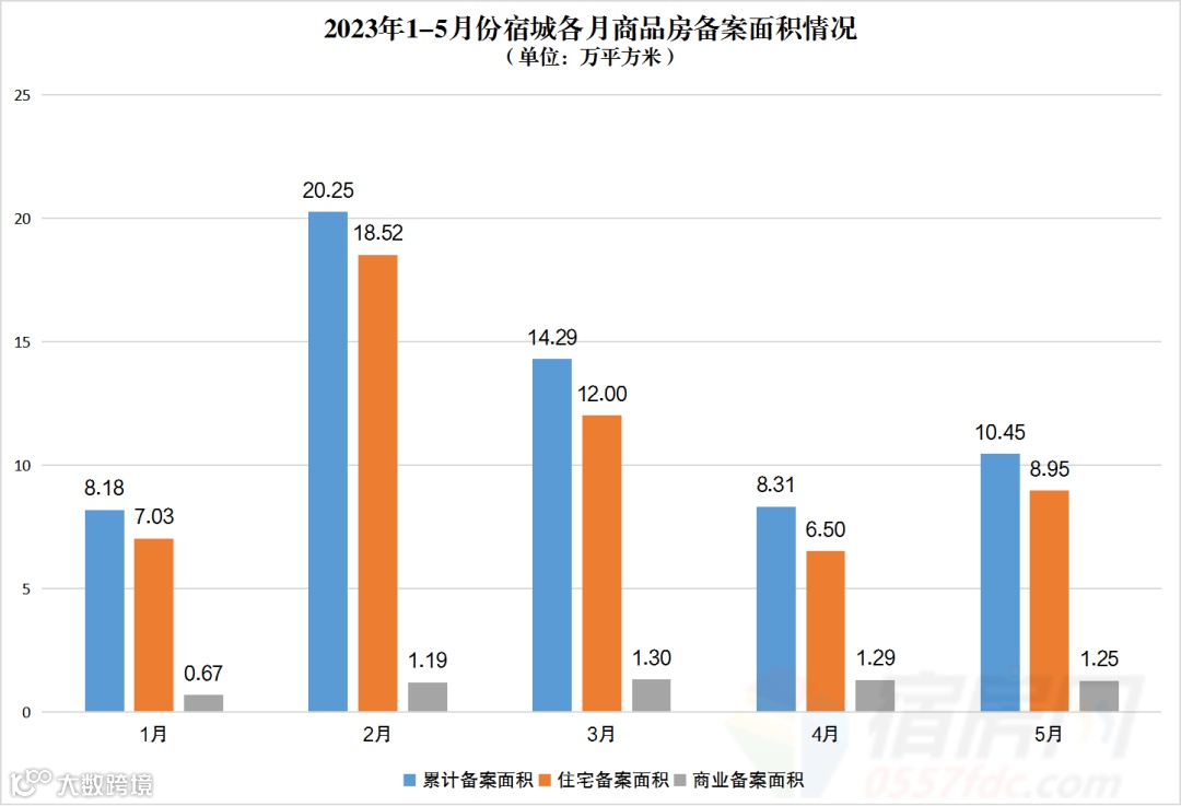 前5个月,宿城商品房销售备案面积在2月份达到20万平方米的高点后,连续两个月下滑,5月份止跌回升。