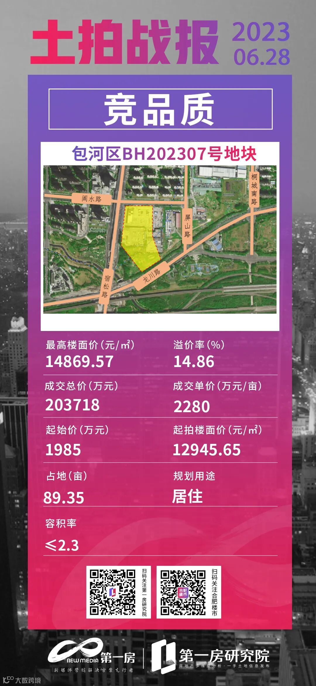 包河区BH202307号地块34家房企参拍,与之前网传20家房企报名人数更多,直接封顶进入竞品质阶段,34家房企均参与竞品质。地块成交单价2280万元/亩,居住楼面价14869.57元/㎡,溢价率14.86%。