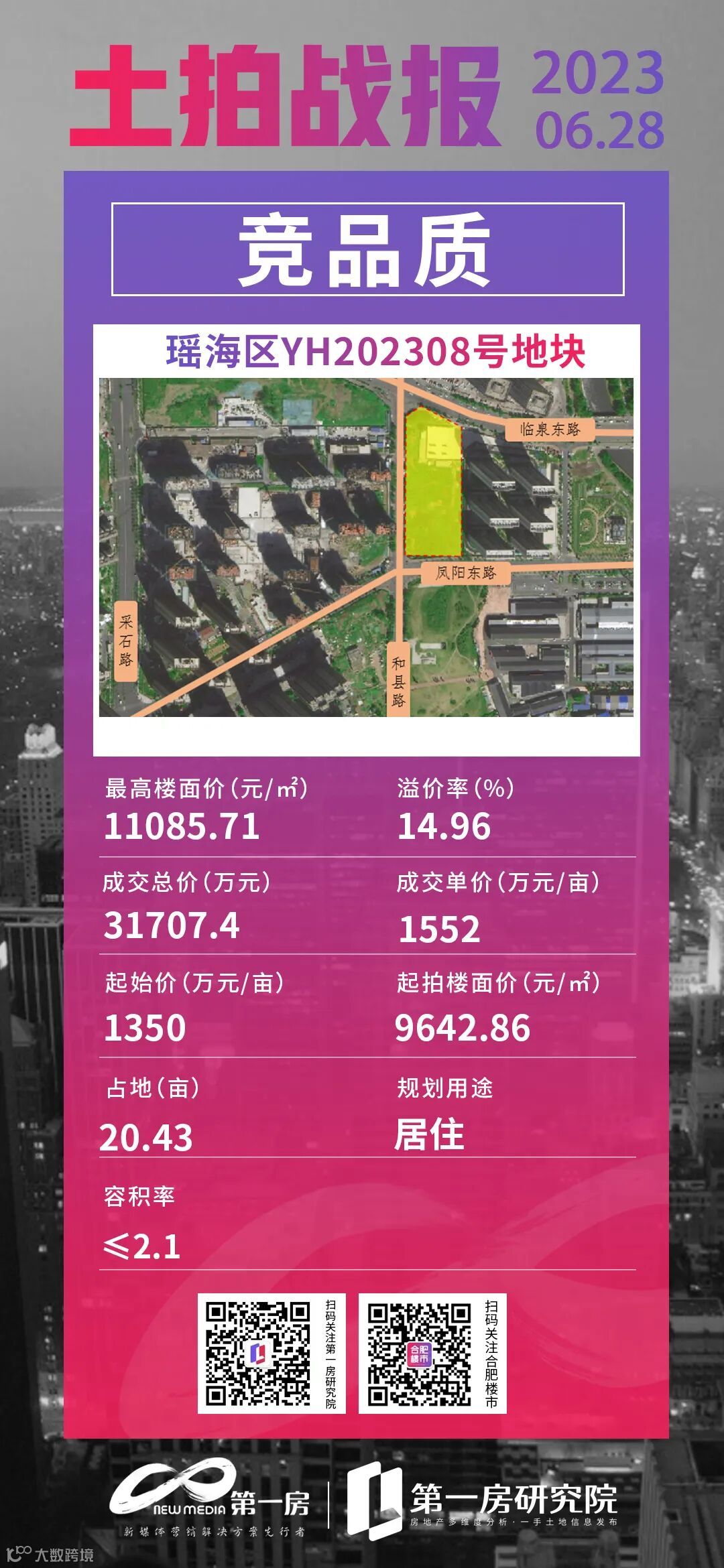 瑶海区YH202308号地块有安徽建工和顺、伟星、保利等4家房企参拍,最终转竞高品质摇号阶段。地块成交单价1552万元/亩,居住楼面价11085.71元/㎡,溢价率14.96%。