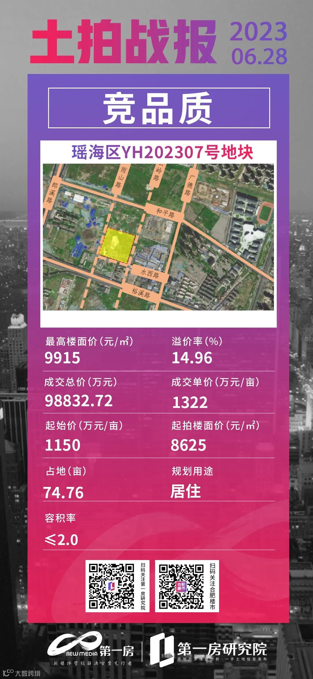 瑶海区YH202307号地块有文德、华力、中海、华润、中国铁建、安徽建工和顺、天阜、伟星、保利9家房企参拍,最终7家房企参与竞品质。地块成交单价1322万元/亩,居住楼面价9915元/㎡,溢价率14.96%。