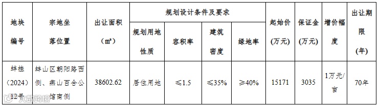 本次出让宗地的出让文件(包含出让须知、规划设计条件及红线图等相关电子资料),竞买人可通过访问蚌埠市自然资源和规划局土地招拍挂网上报名受理系统(网址: