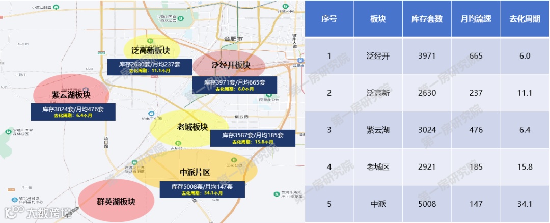 库存方面,肥西县广义总存量17554套,月均1710套,理论去化周期10.3个月。其中泛经开去化周期最短、流速第一,紫云湖流速第二,去化周期第二,中派片区库存量最高,去化周期也最长。