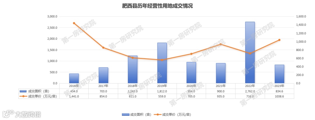 作为合肥三县市场的“领头羊”,肥西市场发展迅猛。肥西县近6年经营性用地年均成交量1008亩,2022年成交2762亩,对比2021年全年增长207%,土地规模翻近三倍。土地成交单价方面近几年,肥西县经营性用地成交均价相对稳定,平均年成交均价稳定在746万/亩。