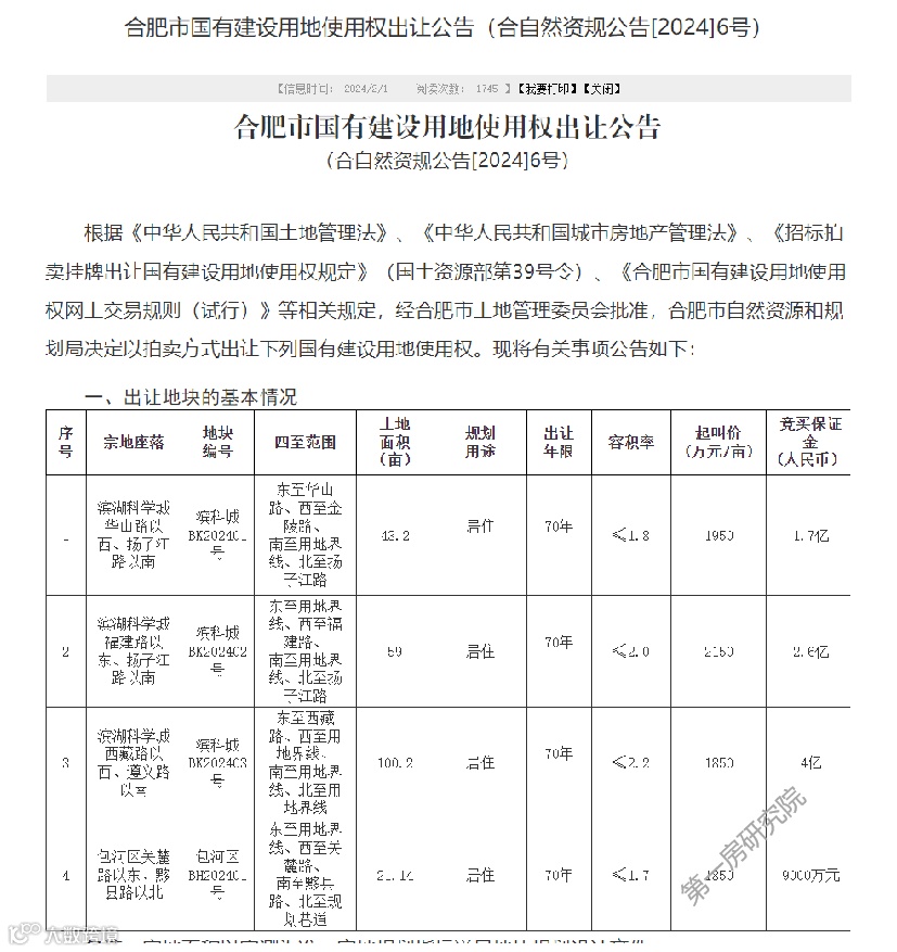 4宗223亩,最高利润超20%!2024年合肥首场土拍地王能否再现?