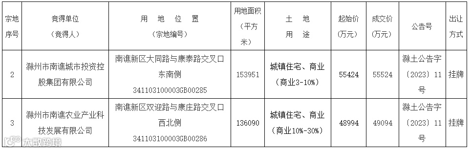 导读:2023年7月21日,滁州市自然资源和规划局在市公共资源交易中心公开挂牌出让3宗经营性用地,成交2宗。根据原