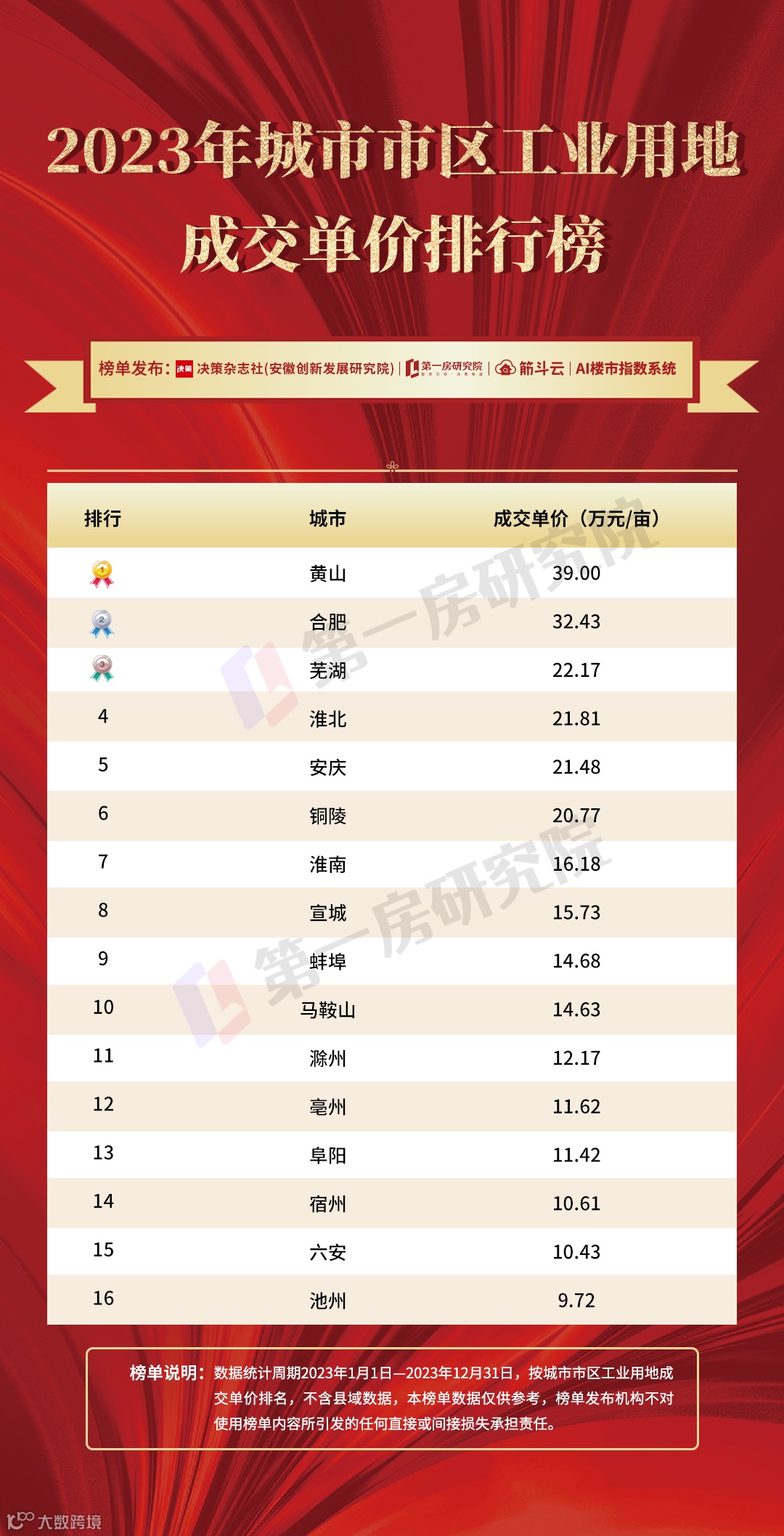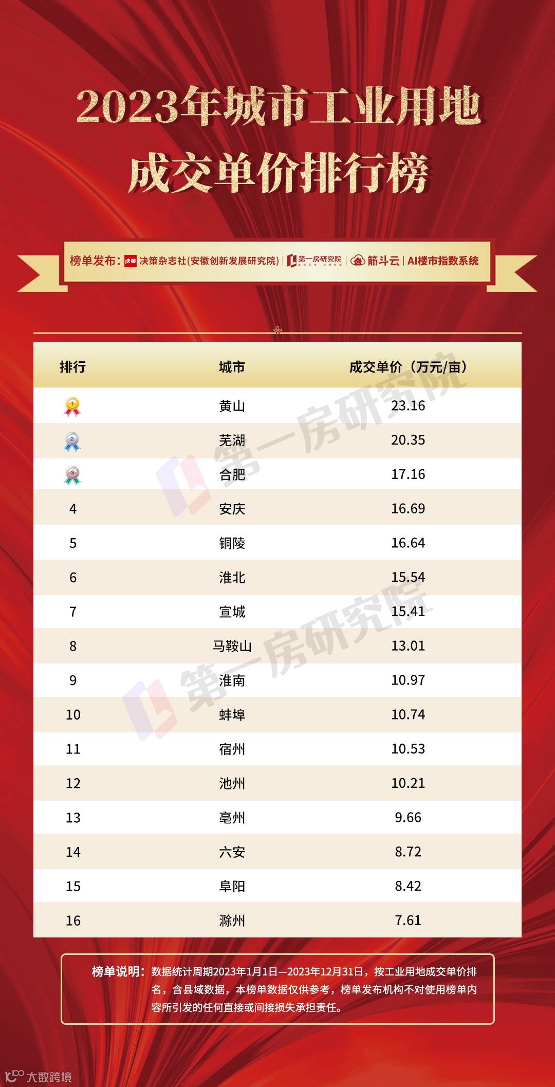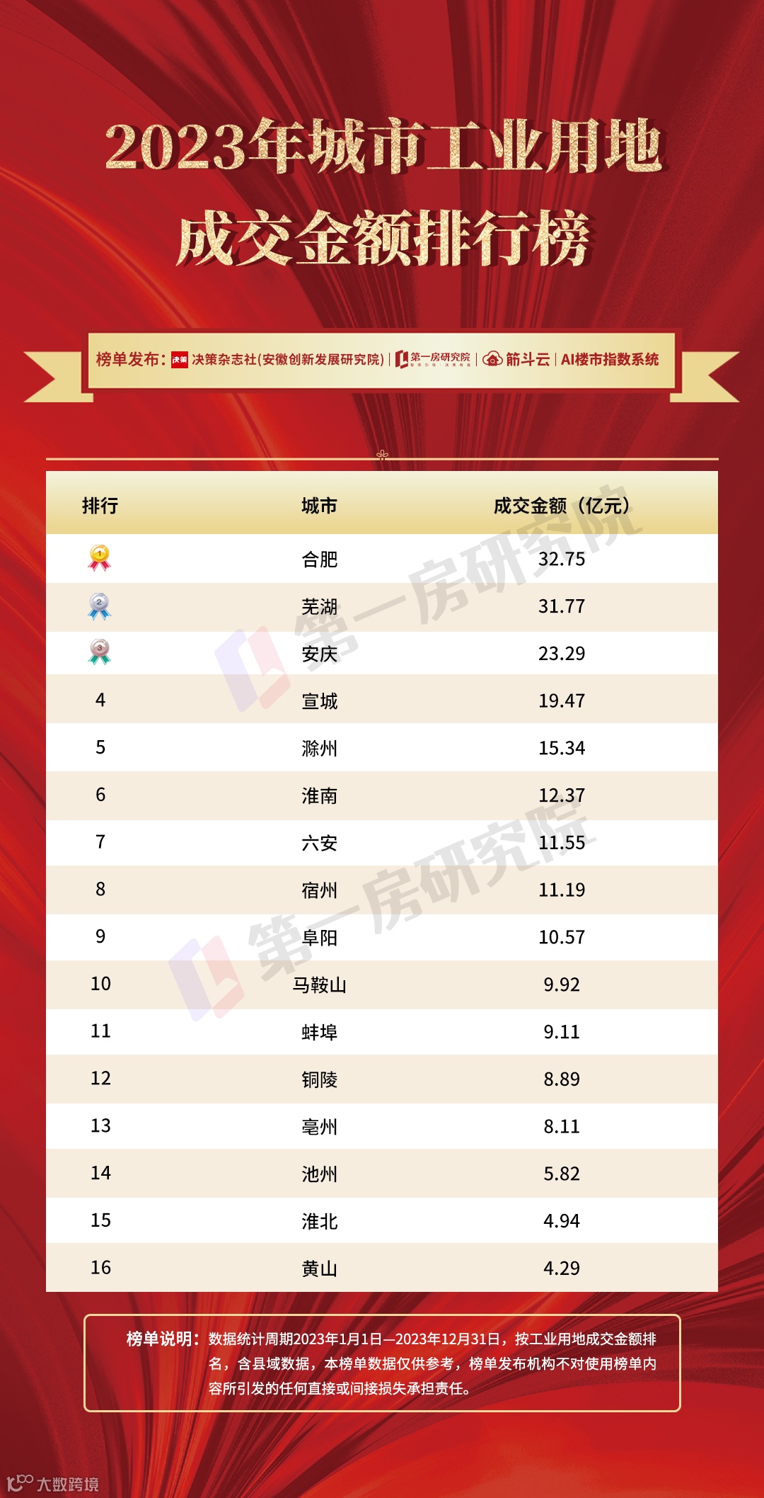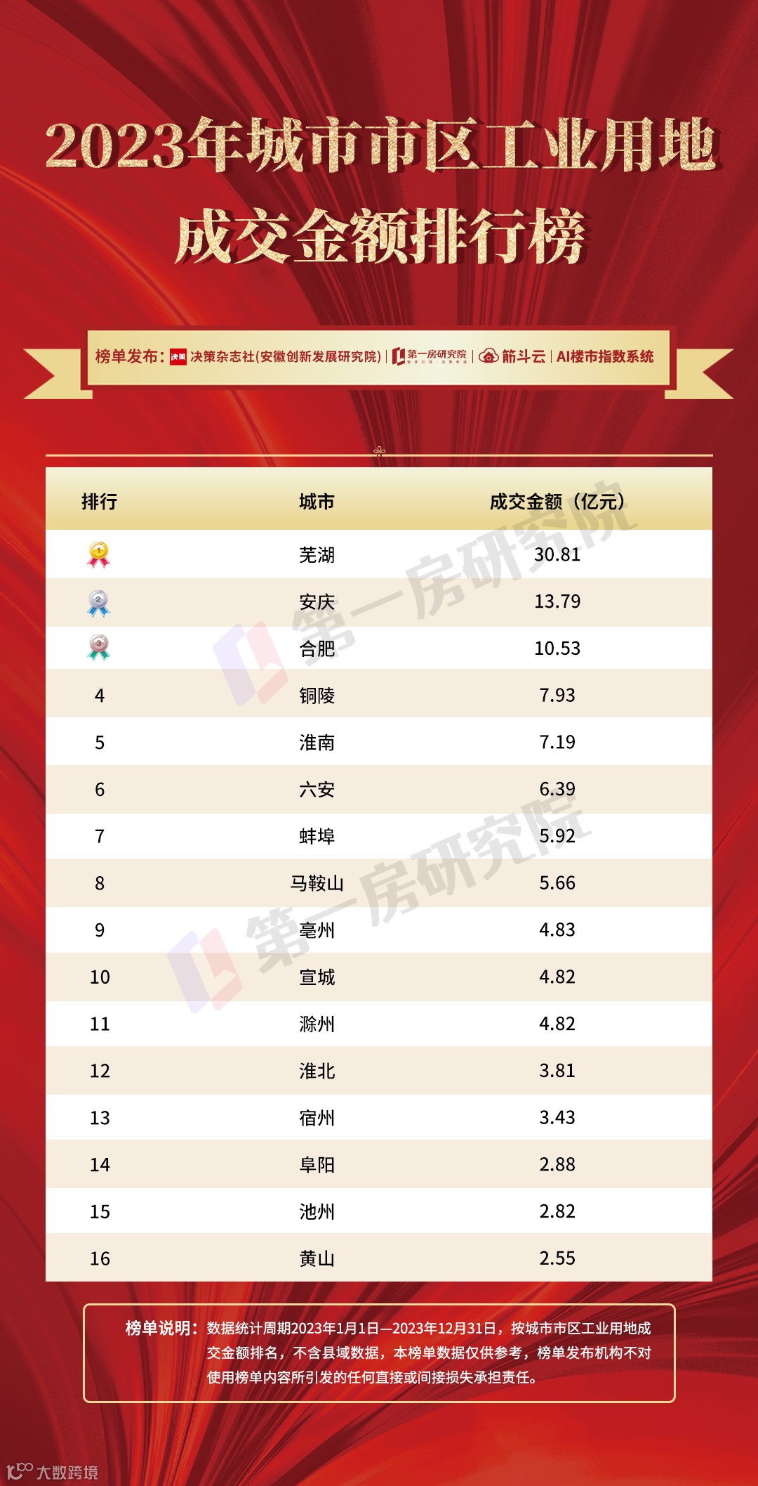 2023年安徽省城市工业用地榜单权威发布,滁州、合肥、芜湖领跑!