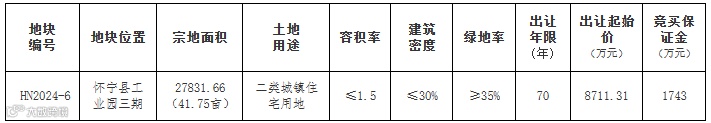 备注:体规划指标按怀宁经开区管委会出具的JGT2024006号规划条件执行;地块起始价不含契税、印花税;地块准确面积以测绘部门提供的宗地图为准;地块其他出让信息以出让文件为准。