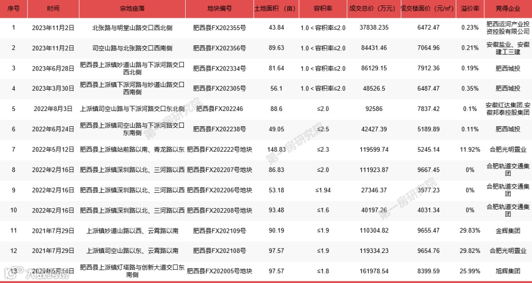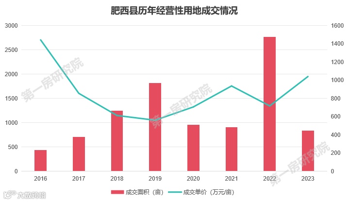 作为全省的第一个“千亿县” ,肥西县自2018年,土地成交单价处于上升趋势,2022年合肥全市经营性用地成交12101亩,肥西成为“成交大户”,成交面积2762亩,占比全市超过20%,对比2021年全年增长207%。2023年成交单价达到了1038.6万元/亩。