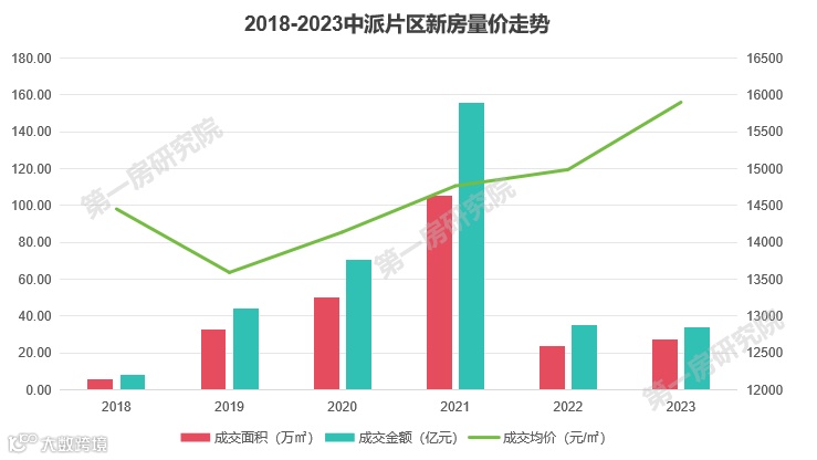 中派片区新房成交均价逐年上涨,2023年成交均价15898元/m²。成交面积在2022年骤降,主要是因为片区内在售项目较少,目前在售楼盘只有邦泰滨湖未来、金辉云缦熙境花园、光明悦,2023年中派片区成交4宗涉宅用地,其中1宗为人才公寓项目,另外3宗还未入市。相信明年新项目入市后,市场会有新的生机。