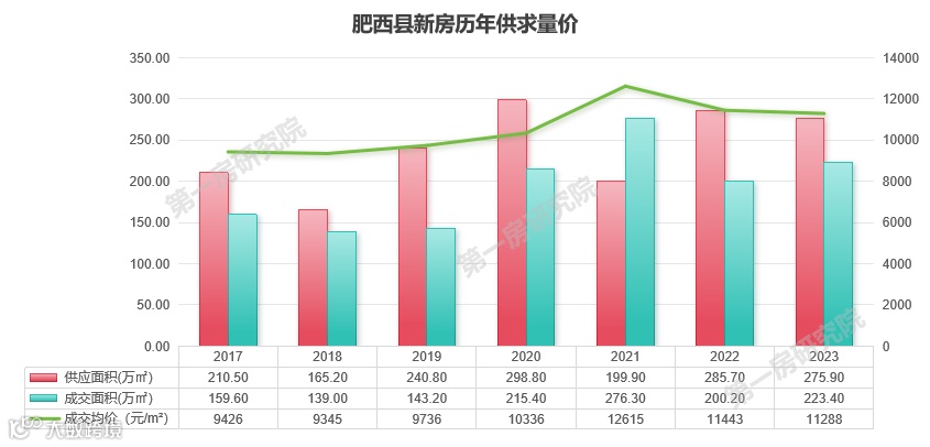 根据肥西县历年的新房供求可以看出,2017-2022处于一个上升趋势,在2022年有一个明显的下降,主要受大环境影响,2023年也有个小幅度的上升。2023年成交223.4万㎡,同比上涨11.6%。