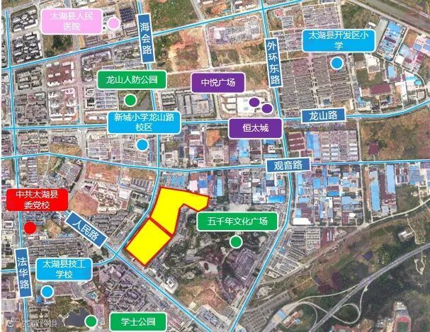 3、海会路东侧、人民路北侧地块:位于海会路与人民路交口东北侧,周边教育及医疗资源丰富,地块邻近太湖县技工学校,1.3公里范围内有太湖县开发区小学、新城小学龙山路校区、太湖人民医院等。
