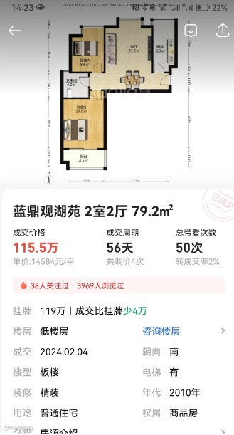 蓝鼎观湖苑一套79㎡的两室户型,成交价更是跌破1.5万/㎡,14584元/㎡就成交。