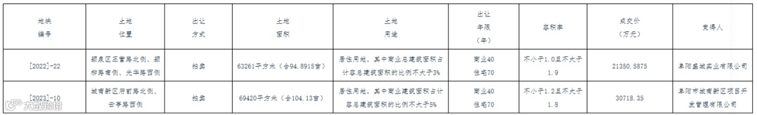 阜阳盛城实业有限公司、阜阳市城南新区项目开发管理有限公司分别拿下阜阳1宗商住用地