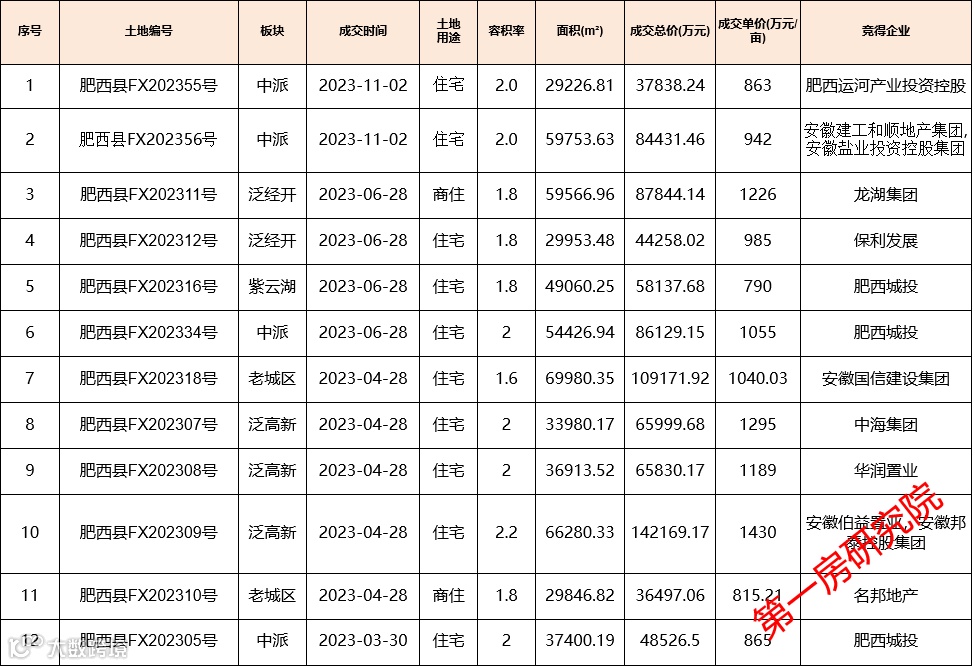今年肥西县共供应了17宗涉宅地块,最终成交12宗地块,共计约834亩。4月份应该是肥西最后的高光时刻,来自北雁湖、繁华西、上派县城5宗居住用地全部满分竞品质。此后市场日益冷淡,龙湖、保利在泛经开各拿下一宗地块,安徽建工和顺地产和安徽盐业在中派联合拿了一宗地块。