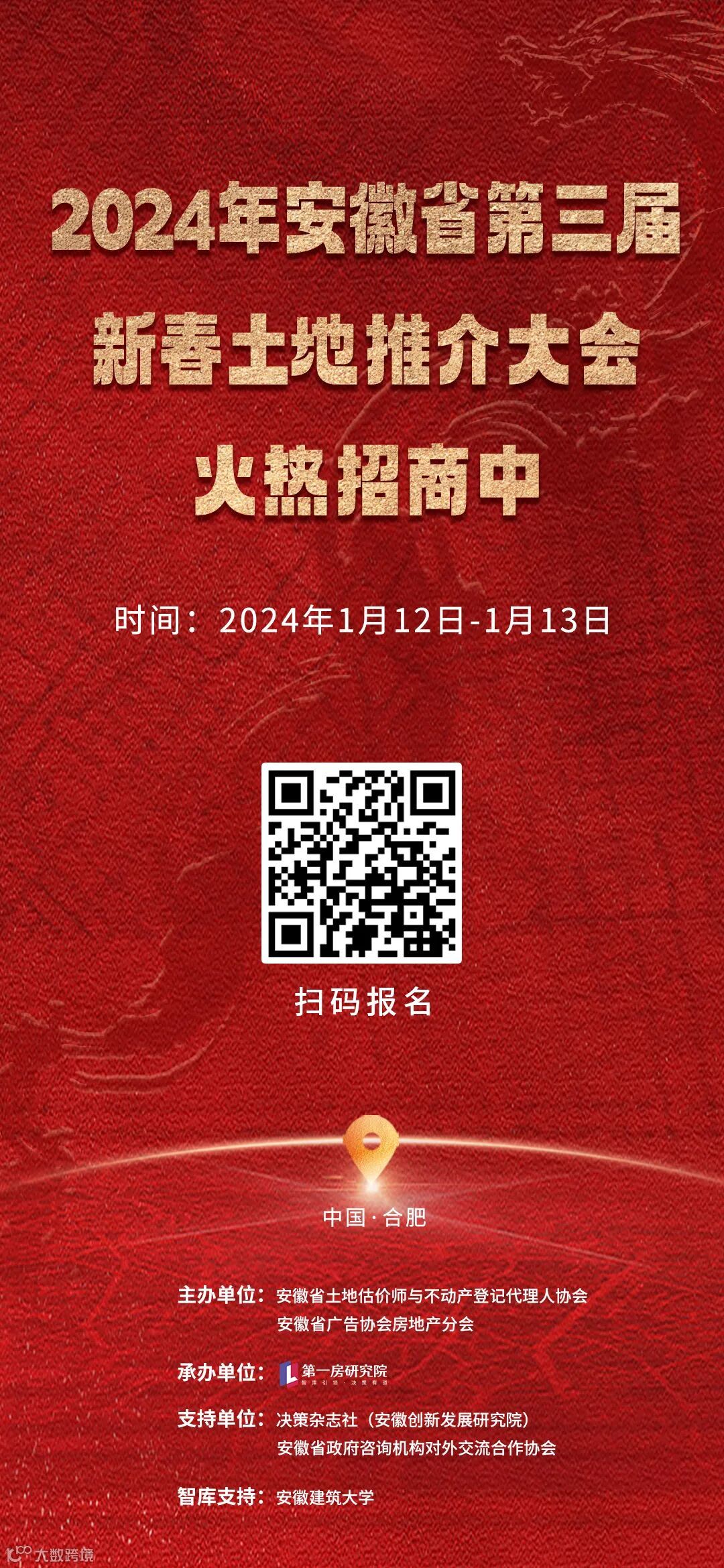 2024年1月11日-1月13日,由安徽省土地估价师与不动产登记代理人协会、安徽省广告协会房地产分会主办,第一房研究院承办,决策杂志社(安徽创新发展研究院)、安徽省政府咨询机构对外交流合作协会、安徽省房地产研究会支持,安徽建筑大学智库支持的第三届安徽省新春土地推介大会将在合肥丰大国际大酒店举办,届时将会公布2024年供地计划。