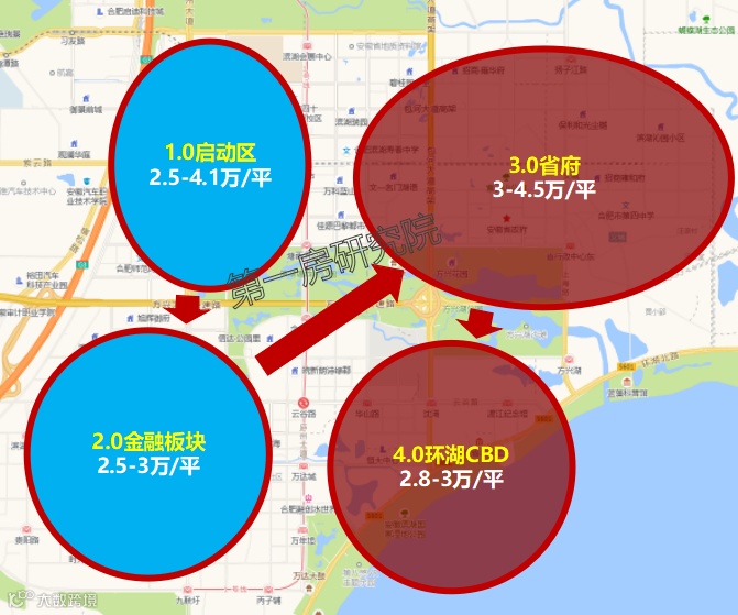 滨湖1.0启动区,二手房挂价2..5-4.1万/平;2.0金融板块,二手房挂价2.5-3万/平;3.0省府板块,二手房挂价3-4万/平;4.0环湖CBD板块,二手房挂价2.8-3万/平。