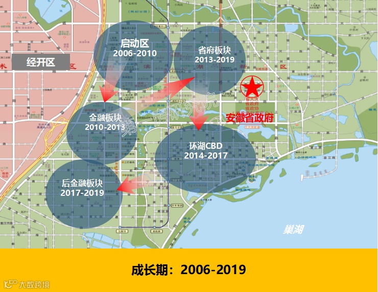 2006年-2019年,滨湖处于成长期,从1.0启动区到2.0金融板块再到3.0滨湖省府板块再到4.0环湖CBD板块,最后再回到2.0金融板块,历时13年。整个滨湖大刀阔斧,全面开发,发展轨迹形成了一个“6字”。从发展的结果来看,这套“6”字型组合拳确实打得很6。