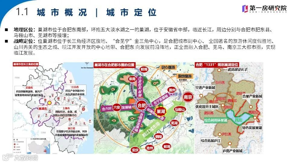 战略定位:位巢湖市位于长三角经济区腹地、“合芜宁”金三角中心,是合肥城市副中心、 全国著名的旅游休闲度假胜地、山川秀美的生态之城、皖江开发开放的中心地带、合肥东 向发展前沿阵地,正全面融入合肥、芜马、