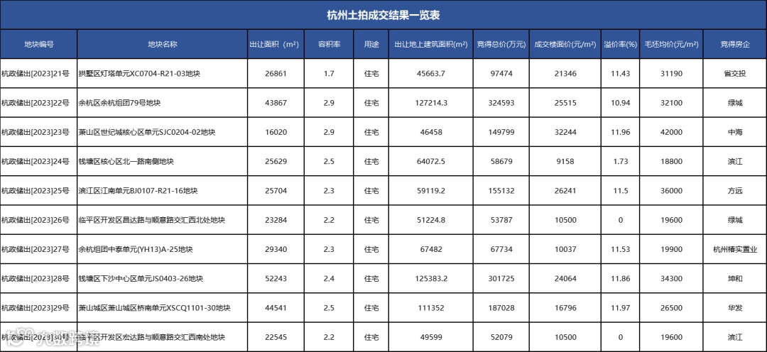 导读:3月29日,杭州市进行了2023年第二次集中土地拍卖,10宗涉宅用地全部成交,8宗溢价成交(其中6宗地块摇号