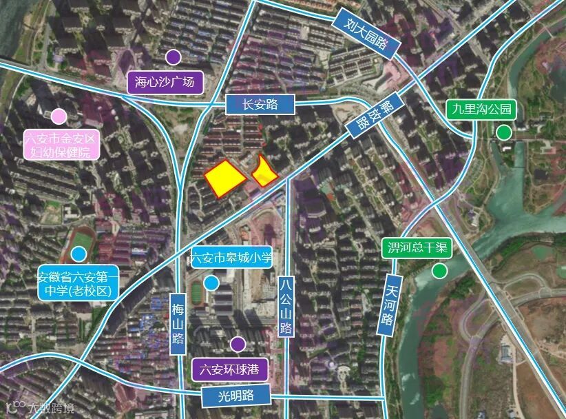 地块周边商业配套有海心沙广场、六安环球港等,生活便捷;地块邻近淠河总干渠,环境优越;地块周边有六安第一中学(老校区)、六安市皋城小学、六安市儿童医院、六安市中医院等教育医疗资源;周边有多个成熟居住小区,生活氛围浓厚。