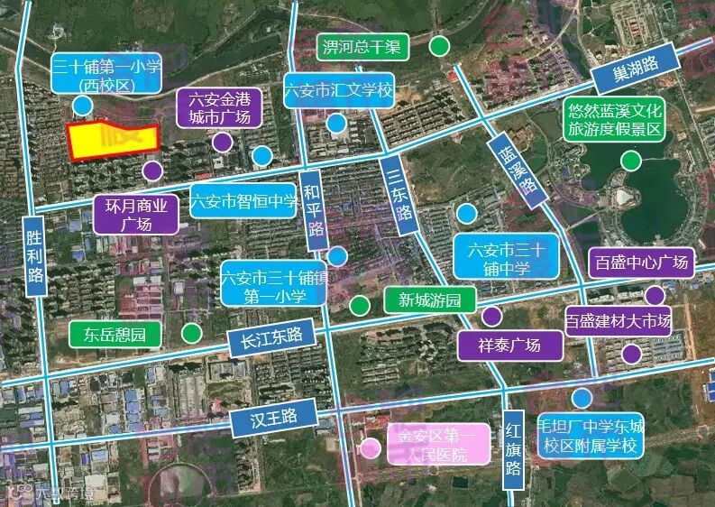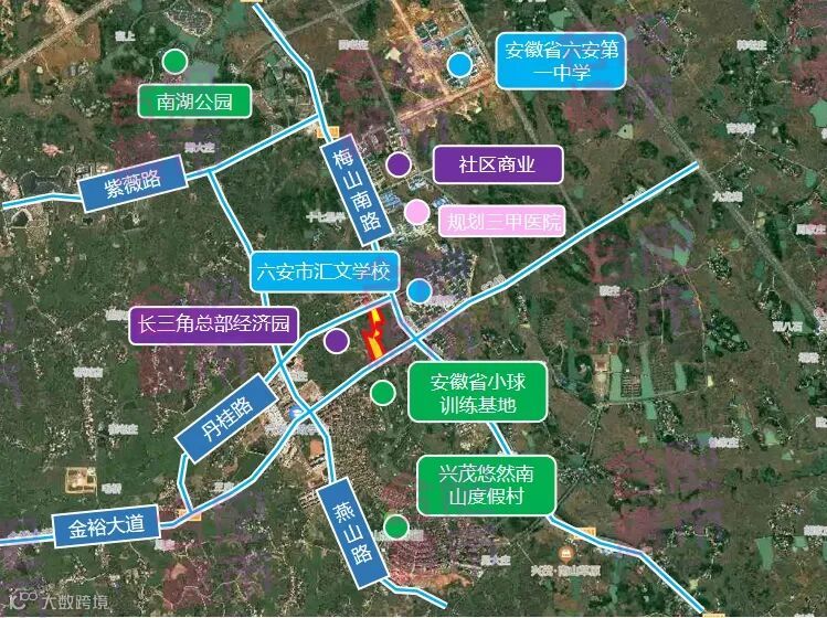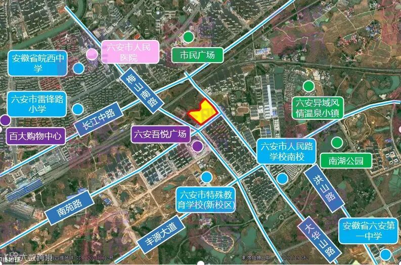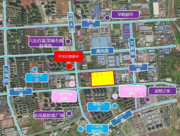 地块周边有振兴江山赋、振兴共和城、温莎小镇、长安西辰天著等成熟小区,居住氛围浓厚,目前仅有光彩大市场(建材市场)、红星美凯龙(家居市场)等专业市场,缺少大型购物中心,适宜打造高品质商业综合体;周边教育资源有六安市城北第二小学、六安市裕安区青山路初级中学;邻近凤栖湖湿地公园、淠河总干渠,生态资源优良;靠近第二人民医院等医院,六安世立医院,医疗资源充沛。