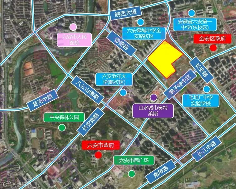该地块教育资源较为集中,有六安第一中学(东校区)、毛坦厂中学实验学校、六安皋城中学金安路校区、六安老年大学(新校区);地块邻近“城市绿肺”中央森林公园、六安市民广场、市科技馆、市文化馆、市图书馆、皖西博物馆和最大的商业体育综合体中体城,是科教休闲娱乐的上佳场所;紧邻大型商业综合体山水城市奥特莱斯,商业配套充足,生活便捷;邻近六安市人民医院、六安市人民医院体检中心。