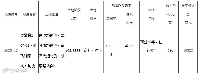 市公共资源交易中心灵璧县分中心以拍卖方式公开出让2023-12号(灵璧县B-07-13原飞翔学校)地块国有建设用地使用权。现将有关事项公告如下: