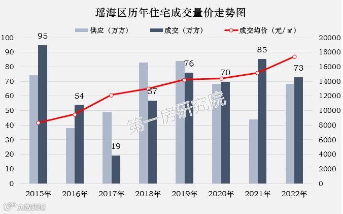格局走势:瑶海市场在16-18年之间一直处于成交低位状态,20年之后确定东部新中心为一级城市中心后,成交量补涨;近两年供求形势逆转,呈现供不应求趋势,市场容量稳步80万方;