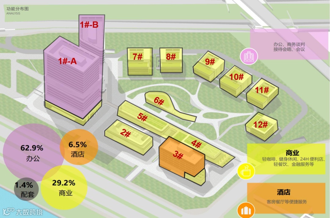 以 “山海连云” 为灵感,打造 “双塔云廊” 百米地标(1号楼),寓意“未来之门”联通世界;7-12号楼独栋墅质商业,满足企业总部需求,私享花园办公,星级酒店(锦江都城)、商业街区(餐饮/咖啡/超市)多维配套,构建 24小时活力“生态圈” 。
