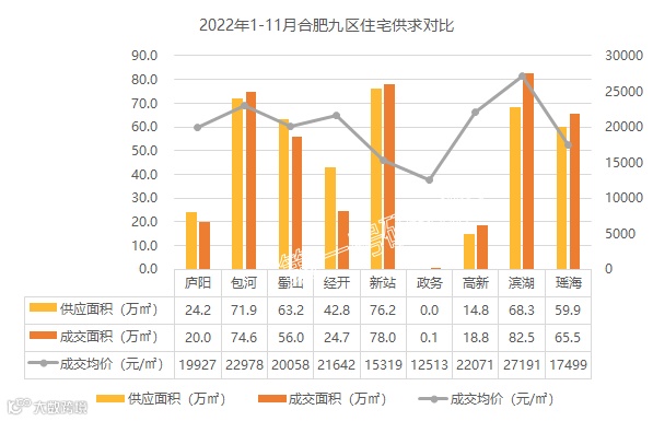新站区近6年新房年均供应123.9万㎡,年均成交121万㎡,供求几近平衡,成交均价12551元/㎡。新站区2022年1-11月供应76.2万㎡,成交77.9万㎡,成交均价15318元/㎡,与往年同期相比呈现出量跌价涨。