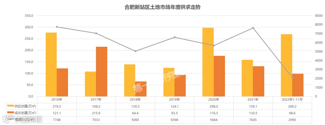 新站区近6年年均供应184.2万㎡,年均成交133.7万㎡,供应成交率72.6%,平均成交楼面价6730元/㎡;2022年1-11月成交楼面价仅2090元/㎡,远低于往年同期,主要是由于零溢价成交两宗安置房用地,故而今年成交楼面价下降明显。、